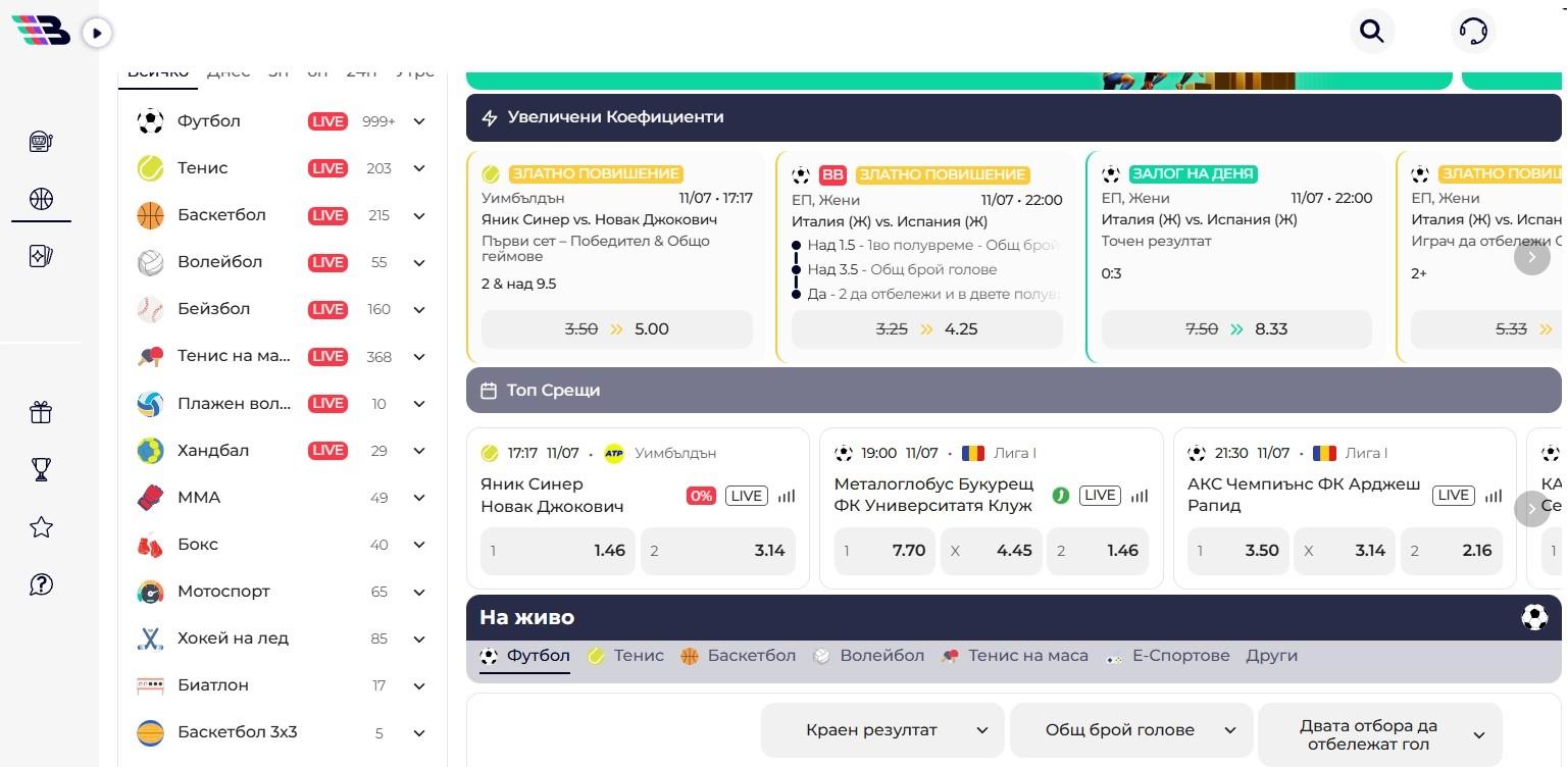 Когато посочите “Спорт” от страничната навигация, системата Ви изпраща до частта за залози. Вляво има филтри за сортиране на мачовете по любими, топ лиги и начален час, а вдясно се намират електронният талон и популярните прогнози за деня.